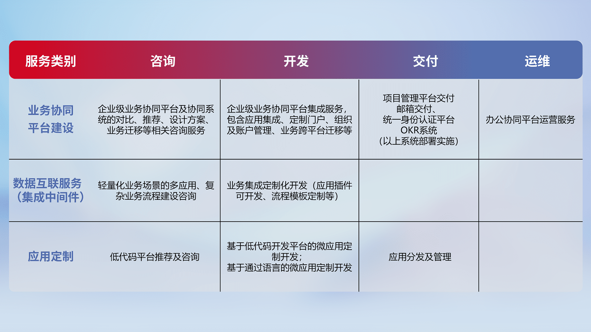 针对钉钉、、、、企微、、IDaas等平台级产品提供产品的规划、、方案、、交付、、、、定制化开发等服务,,,,实现如统一协同办公、、、、智能客户服务、、、混合会议管理、、智能数据查询、、、等业务场景,,,,实现数字化转型。。。